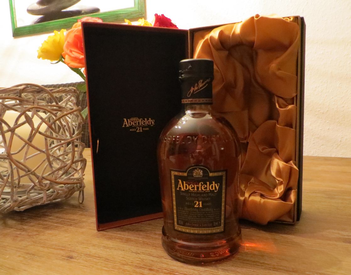 Ich gönne mir in unregelmäßigen Abständen immer mal einen guten Tropfen Singel Malt Whisky. Nachdem ich mir zum Sammeln einen Highland Park Thor und einen Rosebank 21Jahre -1990/2011 zugelegt habe, habe ich mich diesmal zum Verzehr für einen Aberfeldy 21 Jahre entschieden.