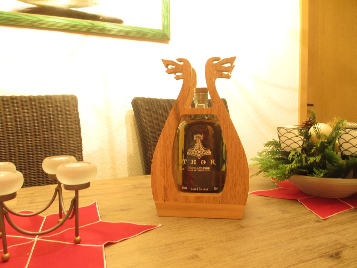 Die Whiskey Flasche ist wie man sieht in einem Vikinger Schiff ähnlichen Holzrahmen untergebracht.