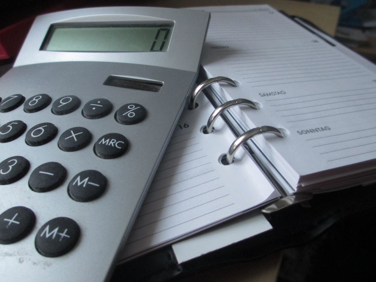 Dieses Bild, welches einen Taschenrechner zeigt der auf einen Terminkalender liegt, kann ohne Gegenleistungen in einen Artikel einer Homepage oder einem Blog zum Thema Finanzen eingebunden werden.